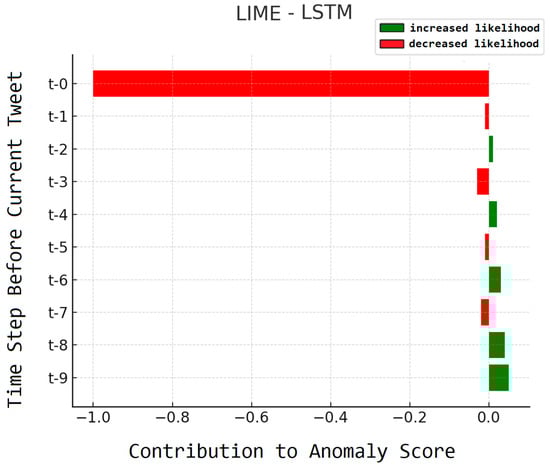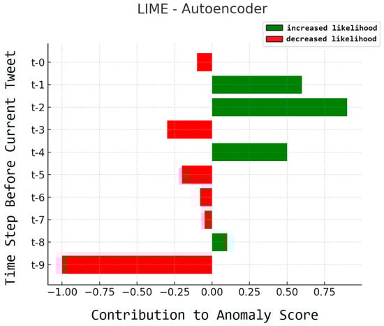 To address model interpretability, the authors applied LIME (local interpretable model-agnostic explanations) to explain the anomaly scores generated by both the autoencoder and LSTM. A representative sequence was selected based on its reconstruction error being closest to the 95th percentile anomaly threshold. In the LIME plots (Figure 5 and Figure 6), each feature is labeled as t-i, where i denotes the number of time steps before the current tweet (t-0). Bars indicate how much each sentiment input influenced the anomaly score, with green representing features that increased anomaly likelihood, and red representing those that reduced it.