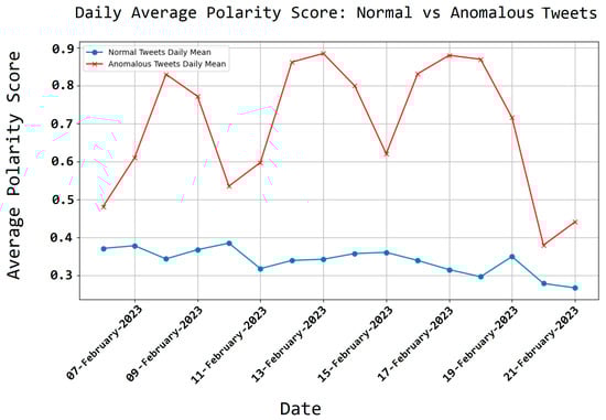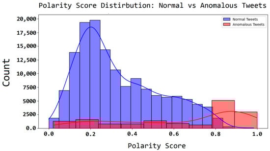 A comparative analysis of anomalies showed that anomalous tweets had a higher average polarity compared to normal tweets. For anomalous tweets, a polarity of 0.639 was detected, while normal tweets had an average polarity of 0.364. The distribution of polarity scores (Figure 7) illustrates significant differences between anomalous and normal tweets. The blue bars correspond to the distribution of polarity scores for normal tweets, and the red bars correspond to the distribution of polarity for anomalous tweets. The lines illustrate the overall trend in the distribution of polarity scores for each group. Anomalous tweets show polarity scores with extremes on the scale, displaying strongly positive or significantly negative sentiments. This distribution is in clear contrast to the more neutral distribution of polarity scores for normal tweets. Such a distribution demonstrates the sensitivity and effectiveness of anomaly detection methods by identifying emotionally charged tweets.