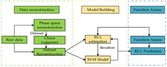 This paper presents a hybrid approach integrating chaos theory with a support vector machine (SVM) model to accurately estimate battery RUL. Firstly, the mutual information method determines the time delay of the monitoring sequence, while the improved false nearest neighbor (Cao) algorithm identifies the embedding dimension, yielding phase space reconstruction parameters. Next, the maximum Lyapunov exponent quantifies the chaotic properties of the capacity decay time series, and a prediction dataset is constructed based on phase space reconstruction theory. Subsequently, exploiting chaotic time-series features, an SVM model is trained for lithium-ion battery RUL prediction. The model is then validated through simulation using the NASA battery dataset. The results indicate that the proposed method achieves high predictive accuracy and stability, providing reliable RUL estimates for a BMS.