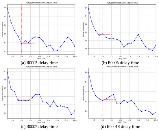 Phase space reconstruction is a prerequisite for analyzing lithium-ion battery capacity decay time series. This study employs the mutual information method to determine the time delay τ; the resulting τ values for four battery types are displayed in Figure 2a–d.