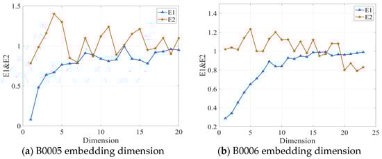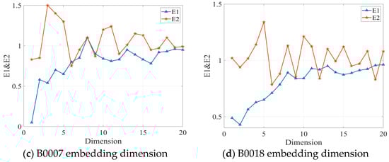 According to the definition of the mutual information method, the time delay corresponding to the first minimum value of the mutual information function I(X,Y) is taken as the time delay. Combined with the calculation results of Figure 2, it can be obtained that the time delay of the phase space reconstruction of the capacity decay time series of battery B0005 is 5, the time delay of the phase space reconstruction of the capacity decay time series of battery B0006 is 4, the time delay of the phase space reconstruction of the capacity decay time series of battery B0007 is 4, and the time delay of the phase space reconstruction of the capacity decay time series of battery B0018 is 5. After obtaining the delay time, the CAO method can be used to find the optimal embedding dimension. Figure 3 shows the relationship diagram of the optimal embedding dimension–E1&E2 for four different types of batteries using the CAO method.