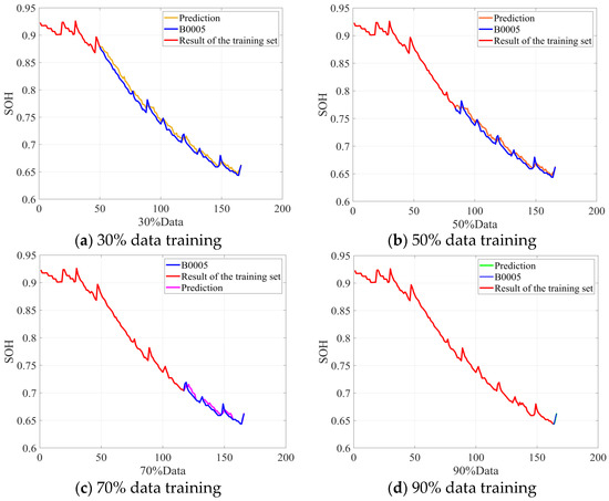 Figure 4 illustrates the simulation results for battery B0005. Although the time-series analysis and prediction lack explicit failure characteristic parameters, the model still captures the overall capacity aging trend. As the training data volume increases, the model’s predictive performance steadily improves. Figure 4 also shows that the RUL prediction error decreases progressively as the training dataset expands.