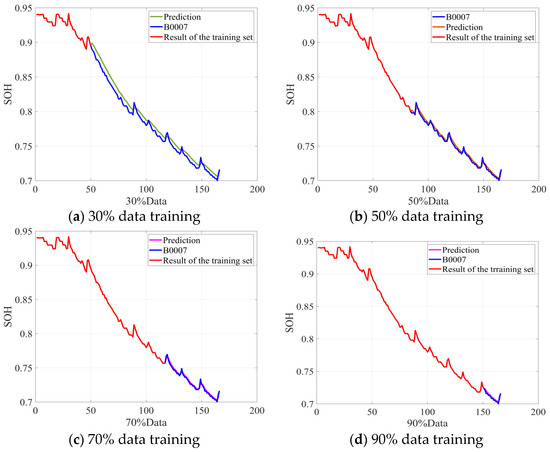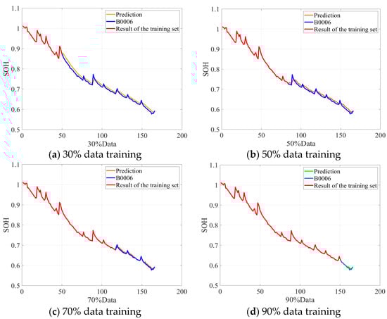 Following the procedure described above, the algorithm was validated on NASA batteries B0006 and B0007. The simulation results for RUL prediction are presented in Figure 5 and Figure 6. These results align closely with those observed for battery B0005. Specifically, as the volume of training data increases, model performance steadily improves. However, the RUL estimates exhibit a positive bias at advanced life stages. This bias arises because, in later cycles, accelerated material degradation intensifies battery nonlinearity, causing the model—trained on current data characteristics—to overestimate the remaining life. Nevertheless, the RUL predictions for batteries B0006 and B0007 remain accurate, further substantiating the proposed algorithm’s efficacy.