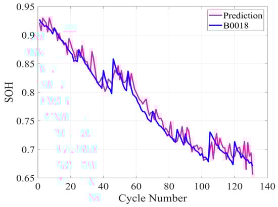 To further validate the proposed method’s predictive capability, the initial 15% of B0018 cycle data were combined with the reconstructed phase space datasets from batteries B0005, B0006, and B0007 to forecast B0018’s RUL. Figure 7 presents the resulting RUL predictions for battery B0018.