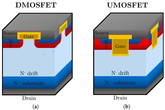 Figure 1 illustrates key MOSFET technologies relevant to this study. The vertical double-diffused MOSFET (DMOSFET) represents the most traditional technology in the power electronics industry, whereas the U-groove MOSFET (UMOSFET), also known as trench FET, is a more modern technology with notable advantages. For instance, UMOSFET fabrication processes enable significantly higher transistor cell densities on semiconductor wafers compared to DMOSFETs [,]. Additionally, UMOSFETs exhibit lower power dissipation than similarly rated DMOSFETs []. In recent years, DMOSFET technology has been gradually replaced by UMOSFET technology, establishing UMOSFETs as one of the most widely used semiconductor devices globally []. Although UMOSFETs generally exhibit superior electrical characteristics, their structural differences relative to DMOSFETs can lead to significantly different responses under radiation exposure. Therefore, it is essential to evaluate the reliability of UMOS technology and improve its radiation hardness before integrating it into high-reliability applications, such as space missions, terrestrial autonomous vehicles, and avionic systems operating at flight altitudes.