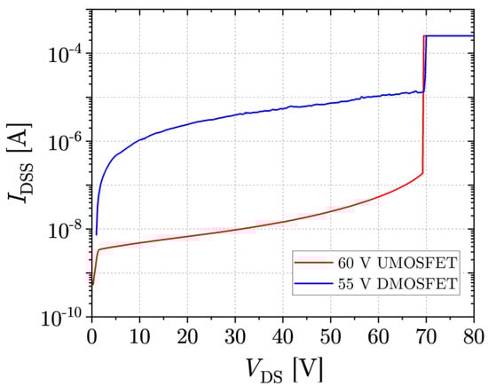 Figure 2 shows representative breakdown voltage curves, with both UMOS and DMOS devices exhibiting equivalent breakdown voltages of . The measurements were performed using high-precision SMUs (HP 41420A Source/Monitor Unit, / ) connected to a high-performance modular system (HP 4142B Modular DC Source/Monitor) controlled by a computer. During these measurements, the DUTs were placed inside a Faraday cage to minimize electronic noise. They were configured in the non-negative gate off-state regime, with gate and source grounded (), while was gradually increased until the drain-source leakage current () reached a predefined limit. Following standard practice, the was defined as the condition where at .