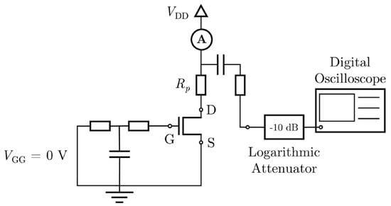 Figure 3 shows the schematic diagram of the experimental setup, which is based on the current-limiting technique [], a standard non-destructive method for protective SEB measurements in power MOSFETs [,,]. Using this setup, potential SEBs are detected and recorded as current pulse signals by an oscilloscope. At the LAFN–USP, a Rohde & Schwarz RTE 1104 oscilloscope (, ) and a Cemipro ESHV 1500-010 power supply ( DC, DC) were used. At the INFN–LNL, a LeCroy WaveRunner 640Zi oscilloscope (, ) and a Keithley 248 power supply ( DC, DC) were utilized. In both setups, the input impedance of oscilloscopes were set to to avoid signal reflections, and an Agilent 355D VHF logarithmic attenuator (, ) prevented them from overcurrent.