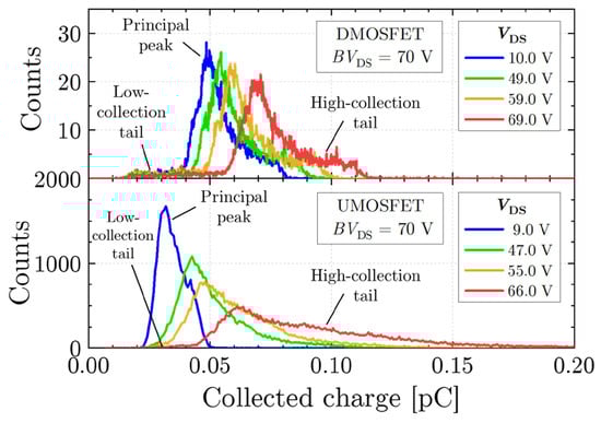 Representative charge collection spectra of alpha particle-induced SEEs in DMOS (top) and UMOS (bottom) power transistors for selected values. Spectra normalized to the same fluence of .