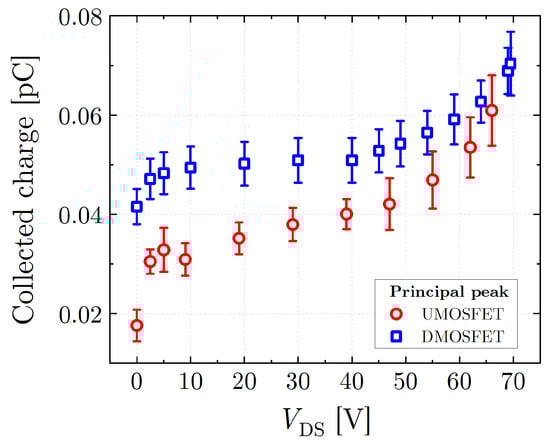 The alpha particles were provided by a 241Am radioactive source, with a measured activity of over a solid angle. The decapsulated DUTs were mounted under vacuum for frontal irradiation at room temperature, configured in the non-negative gate off-state ( and ). Charge collection spectroscopy of SEEs induced by alpha particles was performed by using the acquisition system of the SAFIIRA facility [], Brazil, which utilizes Nuclear Instrumentation Module (NIM) electronics. The system was calibrated with a high-precision charge signal generator (Ortec 419 Precision Pulse Generator). The charge collection spectra of the DUTs were recorded as a function of . Since the UMOSFET and DMOSFET devices studied have similar breakdown voltages, this approach allows for a direct comparison of the main charge collection mechanisms between these FET technologies.