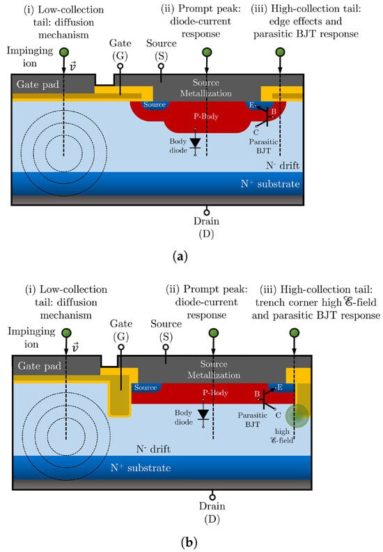 Schematic representation of the main ion-induced charge collection mechanisms in (a) DMOS and (b) UMOS power transistors. E, B, and C correspond to the emitter, base, and collector, respectively, of the parasitic bipolar junction transistor (BJT) structure.