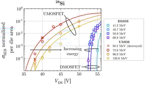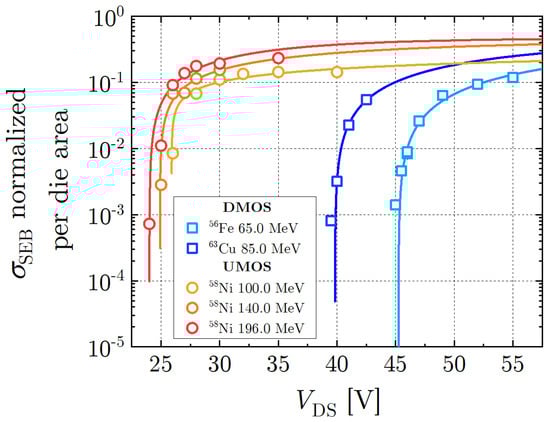 Heavy ion-induced SEB cross sections in the IRLZ34NPbF DMOSFET from previous studies [] were compared with SEB measurements in the IXFA220N06T3 UMOSFET. Both devices have actual breakdown voltages of approximately . No significant ion-induced microdose effects [] were observed in the UMOSFET during irradiation runs, where the measured of the UMOSFET remained below , consistent with its maximum characteristic value of 10 µA, according to the device datasheet []. Unlike the UMOSFETs investigated in [], the IXFA220N06T3 UMOSFET is not particularly designed in a stripe geometry. In order to enable direct comparison between devices with different die areas, the measured were normalized by the die area of each DUTs, enabling a more accurate reliability analysis.