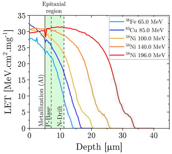 Linear Energy Transfer (LET) curves for heavy ion beams from Figure 8 impinging on a fully depleted 70 V generic MOSFET structure.