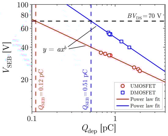 Figure 10 presents the dependence of on for both UMOS and DMOS devices. Across the investigated range, the UMOSFET consistently exhibits significantly lower SEB threshold voltages compared to the DMOSFET. These results complement the earlier demonstration in Figure 7, which demonstrated the greater vulnerability of the UMOSFET under identical ion species. The experimental data include several ion species at various energies. The relationship between and for both device types can be approximated by a power-law model of the form . Table 3 presents the power law curve fit parameters a and b for UMOS and DMOS data. From this model, one estimates the minimum deposited charge within the epitaxial region required to induce SEB () to be for the UMOSFET and for the DMOSFET. These results demonstrate that a UMOSFET with not only exhibits the lower SEB threshold voltages but also requires less deposited charge to initiate SEBs, approximately 20% of the critical charge needed for a DMOSFET counterpart. This simple model can explain why alpha particles from a 241Am source cannot induce SEB in the DUTs. SRIM simulations reveal that alpha particles deposit a maximum of in the fully depleted epitaxial region of a 70 V generic MOSFET structure, which remains below the thresholds for both device types. The combination of reduced and lower thresholds makes current UMOSFET designs more susceptible to heavy ion-induced SEB compared to similarly rated DMOSFETs.