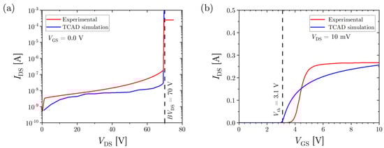 Comparison of (a) blocking and (b) transfer characteristics between the simulated UMOSFET structure and experimental measurements. Since 2–D simulations were performed, a calibration factor of was applied when converting simulated currents to physical units. Simulated using ECORCE [].