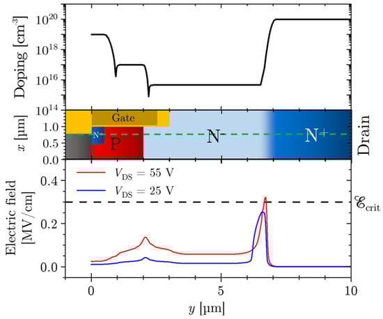 Simulated device structure and spatial distributions of the peak electric field in a 70 V UMOSFET at (dashed green line), induced by a 28Si at striking the N–source region. Simulated using ECORCE [].