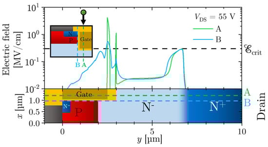 Spatial distributions of the peak electric field in a 70 V UMOSFET at , induced by a 28 at striking the trench gate column. The field distributions are observed along both ion strike position (position A, dashed green line, ) and the vicinity of trench sidewalls in silicon (position B, dashed blue line, ). Simulated using ECORCE [].