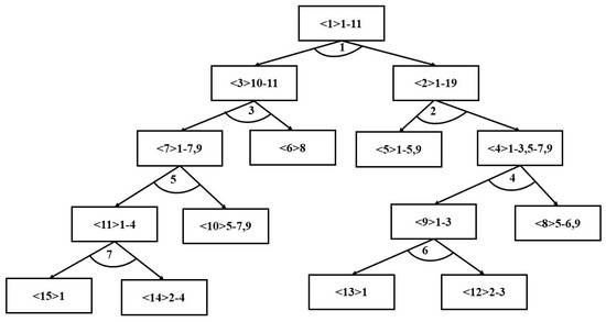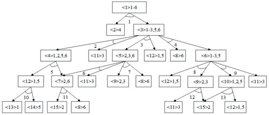 The part compositions of each product may differ, and thus, when disassembling different products, the disassembly steps must conform to the structure of the product, meaning that the disassembly must satisfy the precedence and conflict relationships between disassembly tasks of the product. Such relationships can be represented by an AND/OR graph. Figure 2 shows an AND/OR graph of a washing machine, where <1> represents Component 1, which is composed of basic parts No. 1 to No. 6, and arcs 1–13 represent 13 disassembly tasks. Considering these relationships between disassembly tasks, we formulate a mixed-integer linear programming model based on the following assumptions: