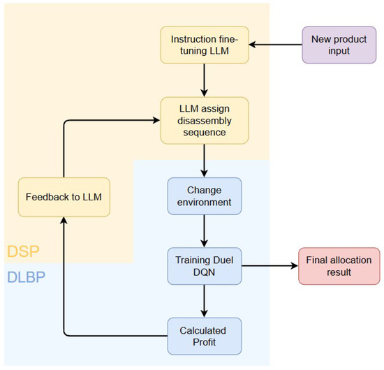 As illustrated in Figure 3, the proposed framework decomposes the problem into two stages: (1) the Disassembly Sequence Problem (DSP), where the LLM generates efficient disassembly sequences and allocates products to disassembly lines; and (2) the Disassembly Line Balancing Problem (DLBP), where the Duel-DQN assigns specific disassembly tasks to workstations under posture and precedence constraints. Information flows between the two stages iteratively to refine decision-making based on performance feedback.
