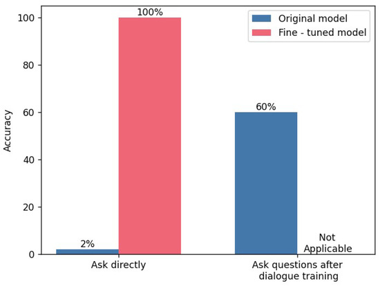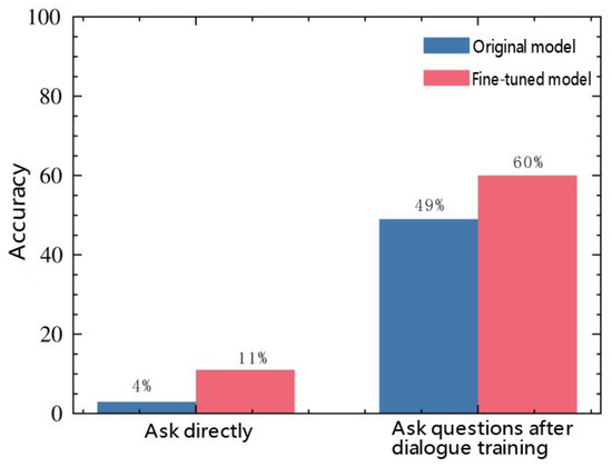 Figure 4 shows the experimental results demonstrating the accuracy rates of the models in solving DSP under two different scenarios, respectively. On the left side, the figure presents the accuracy rates of the original model and the fine-tuned model when directly asked questions. It can be observed that when asking questions directly without providing relevant hints or training to the model, the model has no clue about the direction of the problem. Consequently, within 15,000 queries, the number of times the model can obtain the correct disassembly sequence and provide correct answers is very limited. The accuracy rate after fine-tuning is 100%. This is because all tested questions fall within the content scope of the dataset. As long as the model’s fine-tuning training is successful, the model will naturally memorize these answers. On the right side, the original model after dialogue training is displayed. Through dialogue training, the original model has understood the problem. Although it can provide answers, there is still an error rate. Since the fine-tuned model has already achieved a 100% accuracy rate in direct question-and-answer scenarios, there is no need to conduct dialogue training for it.