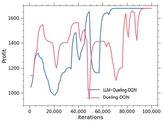 Figure 7 shows the results of the iterations. This section has tracked 100,000 iterations. It can be seen that around the 70,000th step, the LLM-assisted Duel-DQN begins to stabilize, while the Duel-DQN remains in an exploration state. The Duel-DQN algorithm does not finally stabilize and catch up with the LLM-assisted DQN algorithm until around the 95,000th step.