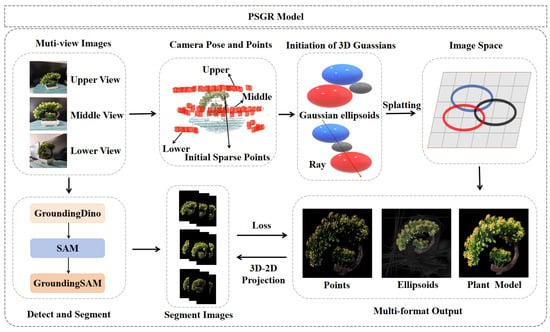 This study proposes a novel model called PSGR, which integrates Grounding Segment Anything Model (Grounding SAM) with 3DGS to achieve high-precision and accelerated plant modeling. The model structure is shown in Figure 1. The diagram illustrates the main stages of the framework, including segmentation, pose estimation, and 3D reconstruction. While not shown as a modular flowchart, the key components—such as 3D–2D projection-guided optimization—are integral to the reconstruction process and are further detailed in Section 3.1, Section 3.2, Section 3.3 and Section 3.4. The PSGR framework combines Grounding SAM, 3DGS, and 3D–2D-guided segmentation techniques to overcome background interference and improve the overall efficiency of 3DGS. First, Grounding SAM performs accurate plant object detection and initial segmentation, effectively separating the plant from a complex background. Then, the 3DGS method builds the 3D model, leveraging its unique point-based representation to capture the fine morphological details of the plant. Finally, a 3D–2D-guided segmentation strategy iteratively optimizes the geometric and texture fidelity between the reconstructed model and the original image data. By integrating PSGR’s efficient segmentation and background removal techniques, this multi-technique framework not only addresses traditional issues like background interference and low computational efficiency but also accelerates the overall reconstruction process. This results in faster training and rendering, making it well-suited for real-time or large-scale plant modeling tasks, while significantly enhancing both the accuracy and generalizability of plant 3D reconstruction.