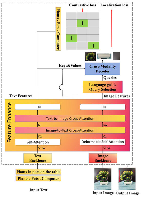 The object detection process of Grounding DINO. The text and the image are respectively encoded into feature vectors through the Text Backbone and the Image Backbone. They are fused by multiple layers of modules, including self-attention. The language-guided mechanism extracts target words from the text and guides the cross-modal decoder to locate regions in the image. Detection is completed based on the matching degree between the detected objects and the text prompts.