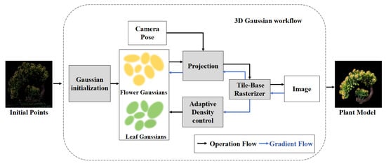 To achieve high-precision and high-fidelity 3D plant modeling, this study adopts a multi-view reconstruction approach based on 3D Gaussian splatting. The method consists of three key stages: the initialization of 3D Gaussian ellipsoids, rasterization-based Gaussian rendering, and the density regulation of Gaussian points. The initial plant point cloud is used to initialize Gaussians, generating Gaussian ellipsoids for leaves and flowers. These are projected using camera poses and processed through adaptive density control. A tile-based rasterizer then renders the final plant image. The overall workflow is illustrated in Figure 3.