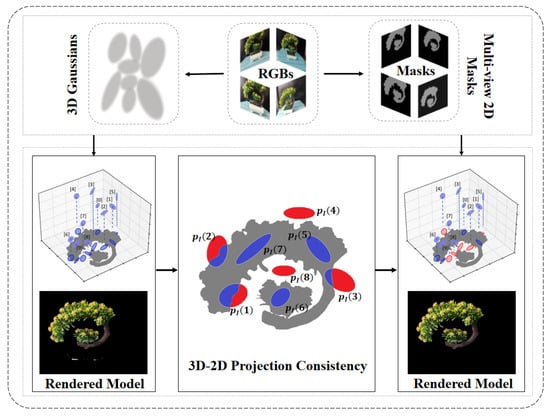 In the process of 3D plant reconstruction, overlapping between foreground plants and the background in 2D images can result in coarse segmentation if grounding DINO and SAM are applied without refinement. Moreover, issues such as leaf occlusions and internal holes further degrade reconstruction quality. To address this challenge, we propose a 3D–2D Projection-Guided (3D–2D PG) background optimization strategy in Figure 4. The Gaussian distribution is projected onto the image plane, with each Gaussian ellipsoid having a different projection range, indicated in blue. The red regions represent areas that are irrelevant to the target segmentation. After optimization, the Gaussians belonging to the target are marked in blue, while those not belonging to the target are marked in red. This approach incorporates a projection-guided Gaussian ellipse masking mechanism into the 3DGS pipeline to improve segmentation fidelity and enhance the quality of 3D plant models.