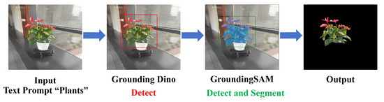 By integrating Grounding DINO [24] with the SAM segmentation model [25], our approach enables accurate background removal for most plants across diverse environments, resulting in cleanly segmented plant foregrounds. Figure 5 illustrates the processing pipeline using the Grounding SAM framework on a plant captured in an arbitrary setting. Given an input image containing a plant and a textual prompt “plant”, Grounding DINO first detects and highlights the region corresponding to the plant. Subsequently, Grounding SAM refines the detection and performs precise segmentation. The final output image clearly presents the isolated foreground plant, demonstrating the effectiveness of the proposed method in complex visual scenes.