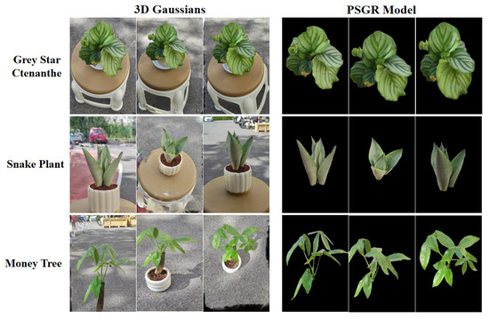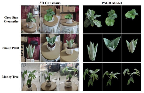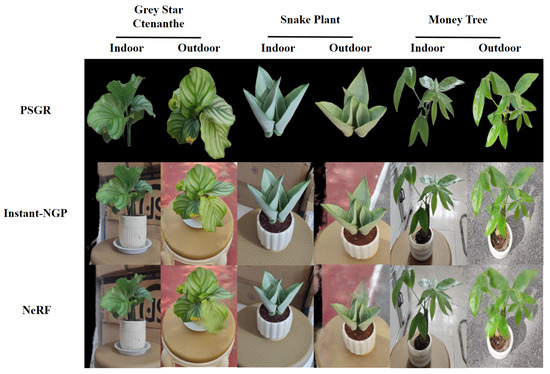 To further evaluate the performance of PSGR, we conducted a comparative experiment with Instant-NGP [31] and the original NeRF model. The comparison includes both qualitative and quantitative results based on three plant species captured in indoor and outdoor environments. As shown in Figure 9, PSGR produces clearer and more detailed reconstructions than the NeRF-based methods. Table 6 further quantifies these differences, showing that PSGR achieves the highest PSNR across all settings while maintaining a significantly reduced training time compared to original NeRF.