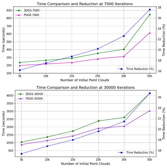 Comparison of time consumption (in seconds) between 3DGS and PSGR under different numbers of initial point clouds at 7000 and 30,000 training iterations.