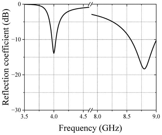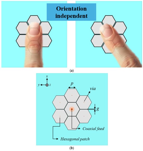 In this paper, the proposed measurement approach utilizes a non-invasive sensing mechanism, where a fingertip is positioned on the sensor to evaluate BGC. We have designed the structural configuration to enhance user convenience when positioning their fingertip on the sensor for measurement, as shown in Figure 1a. Therefore, as illustrated in Figure 1b, we propose a sensor capable of measuring BGC consistently, regardless of fingertip orientation. It consists of six mushroom structures with hexagonal patches and a hexagonal patch at the center of the sensor for coaxial feeding. The designed mushroom structure is an artificial composite right- and left-handed transmission line, which can generate zeroth-order resonance (ZOR) []. The ZOR has two distinct features. First, unlike conventional resonators, the resonance frequency of the ZOR structure is governed by its zero-phase propagation condition (β = 0), rather than the physical length, which allows the antenna to achieve a highly compact size. Second, since it has a uniform vertical electric field toward the ground plane, the sensor using the ZOR can maintain stable and consistent electromagnetic performance under varying conditions. Using the RT/Duroid 5880 substrate (dielectric constant = 2.2, thickness = 1.6 mm, loss tangent = 0.0009) and setting p = 5.9 mm and g = 0.35 mm, the full-wave simulated reflection coefficient by Ansys HFSS is presented in Figure 2. The excitation method and boundary condition are a coaxial feeding with a wave port and a radiation boundary, respectively. The frequencies of ZOR and first-order resonance (FOR) are 4 GHz and 8.8 GHz, respectively. Figure 3 presents the electric field distributions according to phase at ZOR and is provided to confirm that the resonance at 4 GHz is ZOR. As can be seen, the field vectors induced on the hexagonal patch are in-phase and vertical, which is a typical feature of ZOR due to infinite wavelength.