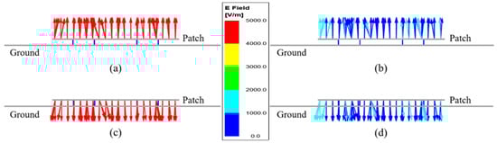 Electric field distributions according to phase at ZOR (x-z plane). (a) 0°. (b) 90°. (c) 180°. (d) 270°.