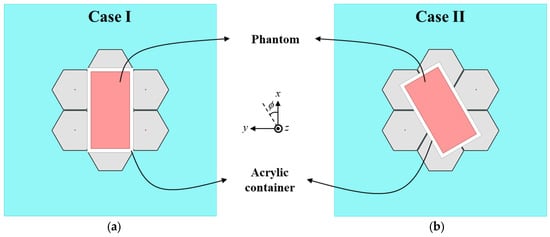 Simulation and measurement settings for the orientation-independent sensor. (a) Rotation angle (φ) 0°. (b) Rotation angle (φ) 30°.