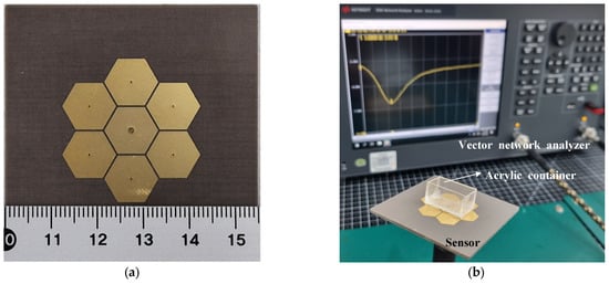 The fabricated non-invasive glucose sensor. (a) Top view of the sensor. (b) Experimental setup.