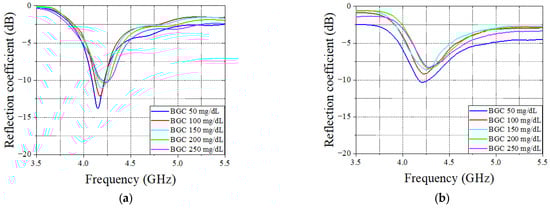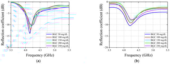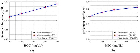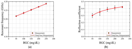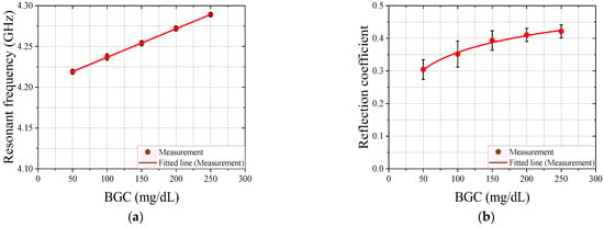 To verify the capability to measure BGC consistently, regardless of fingertip orientation, the simulation and measurement setup is shown in Figure 4. The rectangular fingertip model used in this study simplifies a real human fingertip for the purpose of initial validation. While experimental validation using a real human finger has not been performed in this study, the results obtained using a simplified model are considered sufficient for verifying the fundamental feasibility of the proposed sensing approach. Rather than replicating the anatomical complexity of a real finger, we intentionally employed a simplified square phantom to provide a controlled and consistent evaluation platform, isolating the sensor’s directional response. To fully validate the sensor’s practical applicability, additional research involving real fingertips and environmental factors such as temperature, humidity, and skin contact pressure is necessary. Since the structure of the proposed sensor is symmetrical, measurements were taken for the two cases that exhibit the most significant differences. In case I and case II, the finger phantom angle is 0 degrees and 30 degrees with respect to the vertical reference, respectively. The selection of 0° and 30° was based on the sensor’s symmetrical hexagonal structure, which ensures periodic behavior every 60°. According to our analysis and simulation data, 0° and 30° represent the extreme cases in terms of the sensor’s response variation. As such, they were selected as representative orientations to validate the angular independence. Figure 5 shows the fabricated sensor and the experimental setup. A Keysight E5080B vector network analyzer (VNA) was used to perform the S-parameter measurements. To implement blood glucose variations, a water–glucose solution is used with an acrylic container, as shown in Figure 5. The glucose concentration of the water–glucose solution ranges from 50 to 250 mg/dL, with increments of 50 mg/dL in this paper. The relationship between BGC and the dielectric constant as well as conductivity is crucial for non-invasive glucose sensing technologies. Changes in BGC alter the electrical properties of blood and tissues, affecting their dielectric behavior at different frequencies. The dielectric properties of blood plasma and interstitial fluid are influenced by the glucose concentration due to various factors such as displacement of water molecules, hydrogen bonding disruption, and frequency dependence of dielectric response. The changes in dielectric permittivity and conductivity due to variations in BGC are analyzed using the Cole–Cole model [] for simulation. The relative permittivity decreases from 68.7 to 60.3 as the BGC increases from 50 mg/dL to 250 mg/dL, indicating an inverse correlation between glucose level and dielectric property. Also, the conductivity is considered to be approximately constant with a value of 1.49 S/m over the range of glucose concentrations. Figure 6 and Figure 7 show the comparison of simulated and measured reflection coefficients for various BGC in case I and case II, respectively. While there are minor discrepancies between the simulated and measured results, the overall trend of the reflection coefficient in response to variations in BGC remains consistent. Furthermore, it can be observed that the results of Case I and Case II are highly similar. Mathematical sensing models are developed for the designed sensor using regression analysis relating the BGC to the measured resonance frequency shift and reflection coefficient level. Figure 8 and Figure 9 show the performance of the proposed sensor versus the BGC in case I and case II, respectively. The error bars represent the standard deviation calculated from multiple (n = 10) repeated measurements for each glucose concentration level. The standard deviation at 100 mg/dL was observed to be higher than at other glucose concentration levels in both the resonance frequency and reflection coefficient. This may be attributed to phantom placement variability, increased sensor sensitivity to permittivity transition near this concentration, or nonlinear dielectric properties of the solution. The simulated and measured results show a linear relationship between the resonance frequency shift and the glucose concentration in the solution, with an R2 equal to 0.9998, where R2 (the coefficient of determination) indicates the accuracy of the curve fitting between the two data sets. The obtained mathematical sensing model based on the resonance frequency in each case is as follows: