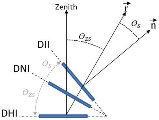 Regarding the relationship between DNI, DII, and direct horizontal irradiance (DHI), it can be observed that when the receptive surface is perpendicular to the solar rays, the power density on the surface equals the incident power density. However, as the angle between the Sun and the surface changes, the intensity on the surface decreases. As shown in Figure 1, the relationship between DII, DNI, and DHI is purely geometric:
