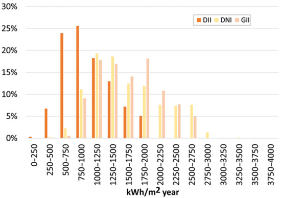 Using the PVGIS Application Program Interface (API), annual DII values were obtained for 61,560 locations spanning latitudes from 85° S to 85° N and longitudes from 180° W to 180° E. The data have a spatial resolution of 1° and range from 2005 to 2014. Out of these locations, 46,063 values correspond to marine areas and 15,597 to terrestrial areas. Annual GHI and DNI values were also obtained for comparison with the DII values. To obtain the DII values, it was assumed that the inclination of the TICPV module is equal to the latitude of the location (β = φ) and that they are oriented towards the equator (α = 0). All these values are presented in the histogram in Figure 2.