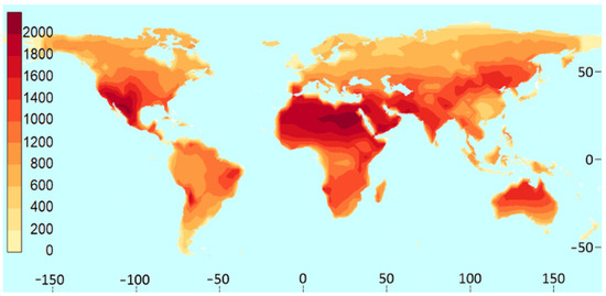 The acquired annual DII data are graphically depicted in Figure 3, using Surfer software developed by Golden Software (ver. 16) [34]. The map highlights areas of interest for TICPV based on relatively high annual DNI values. Africa shows the highest annual DII, with maximum values exceeding 2000 kWh/m2⋅year. The most remarkable regions in terms of DII values are the Sahara Desert and the Kalahari Desert. The Arabian Peninsula also exhibits high DII values, ranging from 1600 to 2000 kWh/m2⋅year. In the Mediterranean, DII averages around 1200 kWh/m2⋅year, representing the highest value in Europe. The Gobi Desert is another area of interest for TICPV due to its high DII values. In Oceania, north-western Australia shows DII values nearing 1400 kWh/m2⋅year. In North America, the western regions of Mexico and the south-western USA, which encompass desert areas, also exhibit favorable conditions for TICPV, with values of around 2000 kWh/m2⋅year. In South America, the Atacama Desert area and surrounding areas display some of the highest annual DII values, around 2000 kWh/m2⋅year.