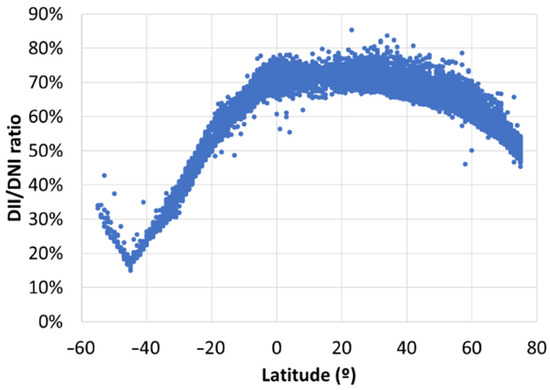 The DII/DNI ratio versus latitude was analyzed to compare TICPV and CPV systems. However, when comparing TICPV with conventional PV, the DII/GII ratio versus latitude does not provide conclusive information. To address this, a detailed map WAS created to more precisely identify areas of interest. When comparing TICPV and CPV, it is critical to note that DNI is always higher than DII, meaning the ratio will be below 100%, and TICPV will always produce less energy than CPV. Nevertheless, TICPV systems can be more cost-effective than CPV systems due to their lower installation costs. To increase its competitiveness with CPV systems, the ratio for TICPV systems should be as high as possible, indicating high DII relative to DNI. As shown in Figure 4, latitudes between 2° S and 6° N have a DII/DNI ratio above 60%, making this range particularly relevant for TICPV systems.
