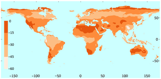 By definition, a negative ∆ (∆ < 0) indicates a reduction in DII. The map areas with values close to zero (dark color) represent regions where the decrease in annual DII relative to GII is minimal. These locations are the most suitable for TICPV system deployment, enabling it to compete with conventional PV systems. As shown in Figure 5, the African continent (both north and south) and Western Australia have the highest proportion of dark areas, indicating a maximum loss of 15%. South Asia also presents some regions with low losses. South America (especially in the southern region of Chile and Argentina) and North America (California, Nevada, and Arizona) also display a low percentage of DII reduction.
