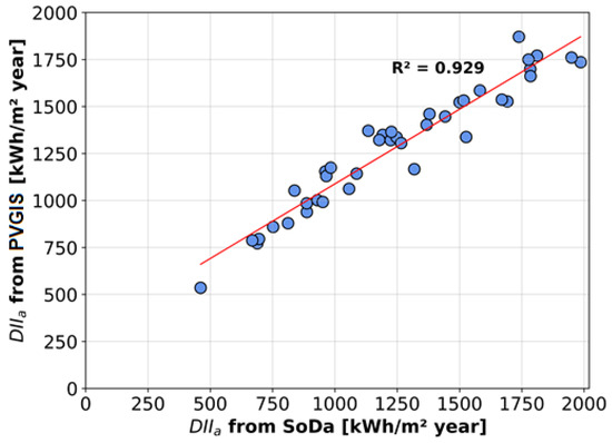 Annual DII (kWh/m2·year) from the SoDa database vs. that from the PVGIS database for 40 terrestrial locations, assuming the tilt is equal to the latitude of the location, and they are oriented towards the equator.