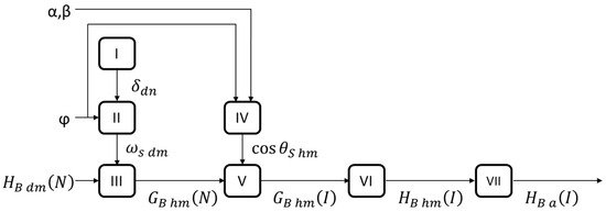 Therefore, the essential input parameters for the mathematical model calculations are the surface azimuth and tilt angle, site latitude, and the twelve-monthly average DNI. The outcome of the mathematical model is the annual DII. The model follows the sequence illustrated in Figure 7: