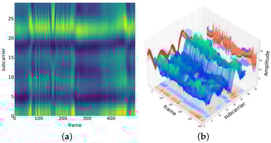 Figure 1 shows the two-dimensional (2D) and three-dimensional (3D) CSI amplitude maps of an example Wi-Fi signal in an indoor environment. The subcarrier axis represents the 30 subcarriers collected from one pair of transmitting and receiving antennas. The frame axis represents the data packets received within 2.5 s. The amplitude axis represents the amplitude magnitude of the CSI.