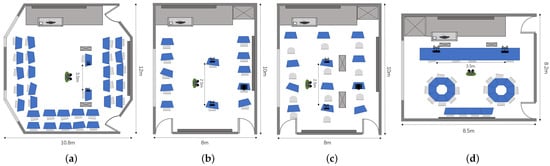 Experimental environmental layouts: (a) , (b) , (c) , and (d) . Notably, and correspond to two distinct configurations within the same room, while and represent separate rooms.