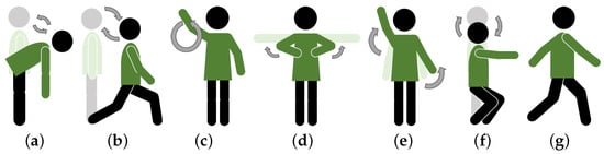 Seven common fitness action and arm movements, including (a) standing forward bend (SFB), (b) lunge (LG), (c) one-arm circle (O), (d) chest expansion (CE), (e) arm stretching (ST), (f) half-squat (HS), (g) walking (WK).