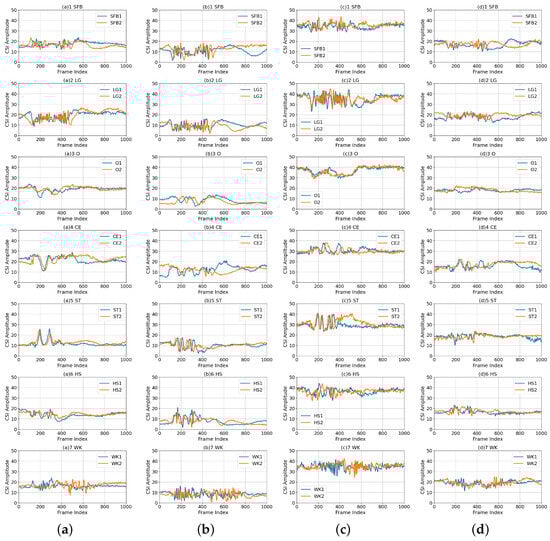 CSI amplitude measurements on the 4 subcarrier. (a–d) Comparisons between different actions (i.e., SFB, LG, O, CE, ST, HS, and WK) in four environments (i.e., (a) , (b) , (c) , and (d) ). Notably, the digits 1 and 2 in the legend indicate two distinct samples belonging to the same action (e.g., SFB 1 and SFB 2 denote two samples measured within the action class SFB).