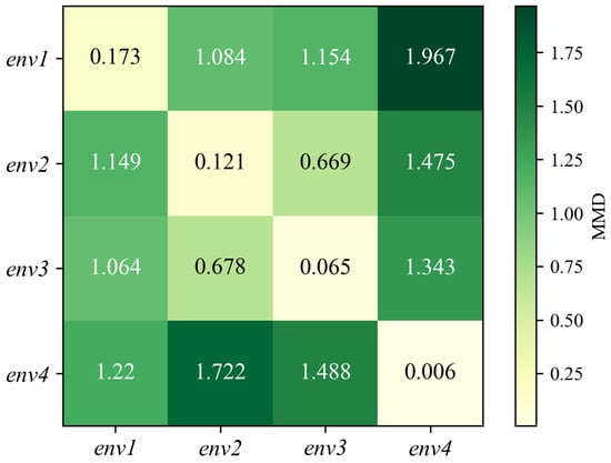 where and are randomly selected samples, and and denote the number of samples in different environment sets, respectively. The function represents a kernel function that maps the original data into a Reproducing Kernel Hilbert Space (RKHS) . Figure 5 visualizes the pairwise MMD between distributions from different environments. Note that a larger metric value in the matrix indicates a greater disparity between the respective environments. The data distribution differences are smaller within the same environment, while they are larger across distinct environments. This article proposes a two-stage optimization method in the CHARS to achieve reliable HAR performance in the target environment.