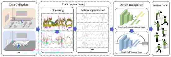 The Internet of Things (IoT) represents a new frontier in information technology, driving significant transformations in various domains of social life, particularly in the area of human–computer interaction (HCI). Within this domain, human action recognition (HAR) has emerged as a particularly prominent and compelling research topic, attracting an ever-growing number of researchers. Currently, research on HAR can be classified into vision-based [,], wearable device-based [], and wireless sensing-based [,] methods. However, the first two methods have certain limitations, such as susceptibility to lighting conditions, low privacy, and reduced user comfort, that constrain their practical applications. In contrast, without relying on cameras or wearable devices, wireless sensing technology [,,,,] leverages signals such as millimeter wave (mmWave), ultra-wideband (UWB), and Wi-Fi to detect the presence and movement of residents; thus, it has the potential to circumvent the above-mentioned issues. As Wi-Fi signals are highly prevalent in indoor settings, they hold immense potential for future HAR applications, especially considering the widespread and continuously increasing use of home wireless networks.