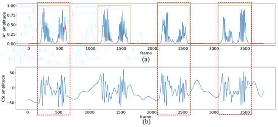 Data segmentation effect of the DDDM algorithm. (a) The waveform of , which reflects the state of the CSI data shown in (b). (b) The waveform of the dimensionality-reduced CSI data; the data clips in the red box represent the action fragments.